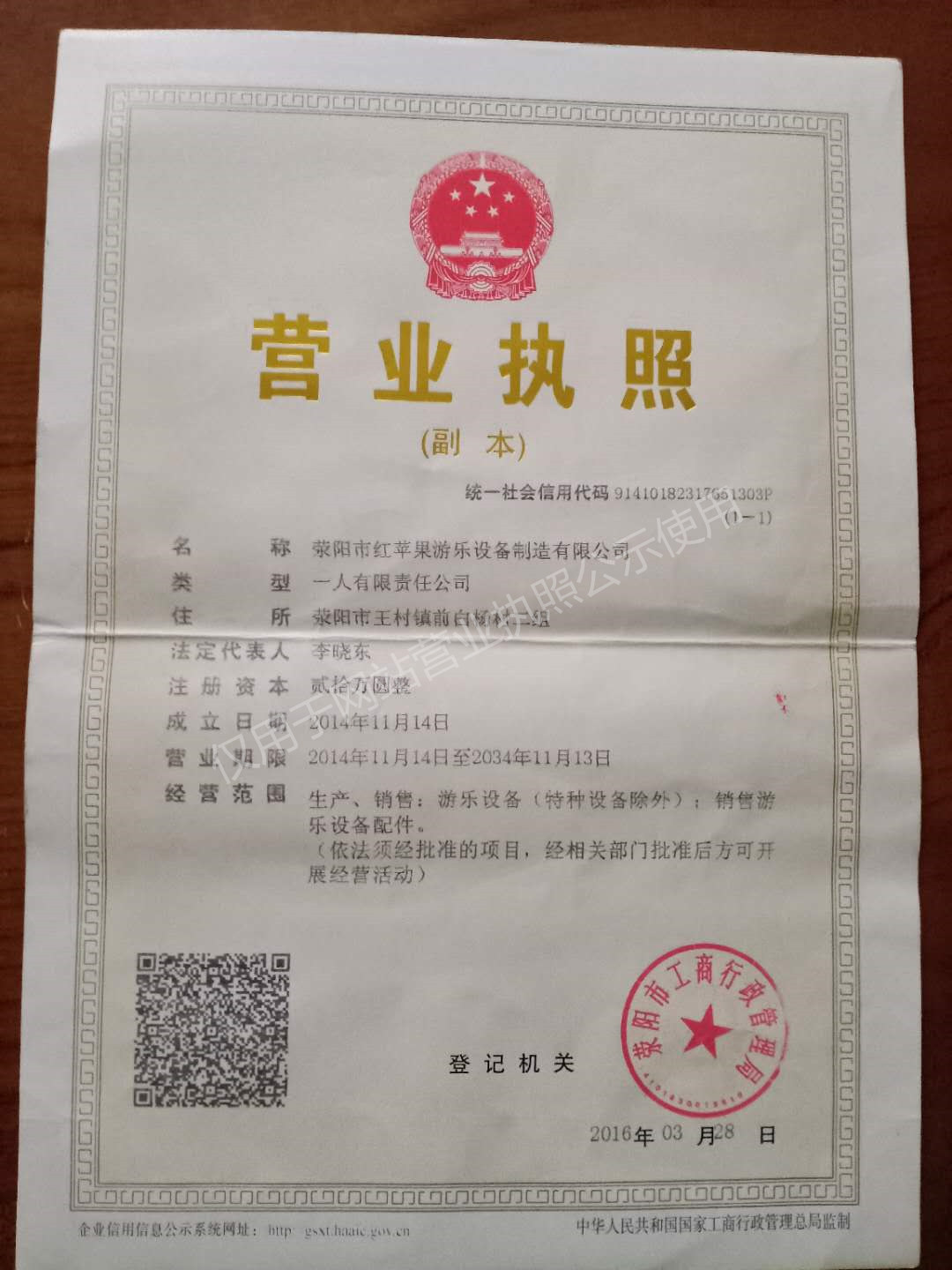 營(yíng)業(yè)執(zhí)照公示來源網(wǎng)站:鄭州市紅蘋果游樂設(shè)備制造有限公司 發(fā)布時(shí)間:2020.06.16點(diǎn)擊次數(shù):次 ![]() |